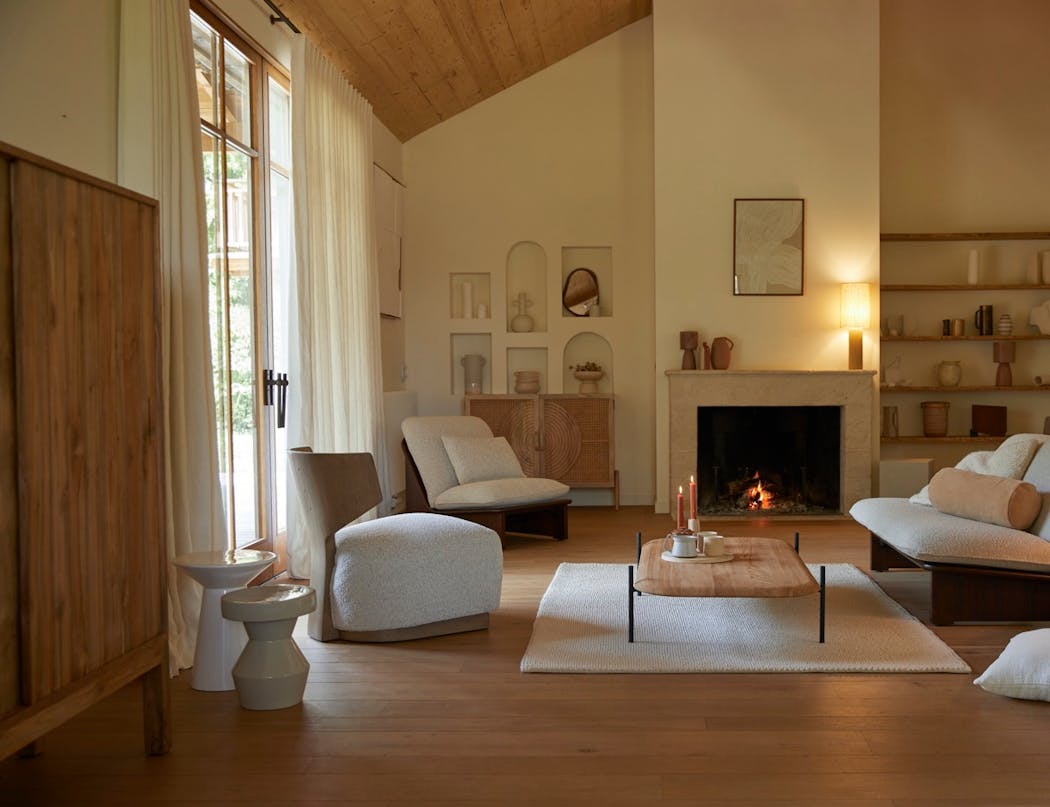 Influence nippone pour ce salon où les meubles bas, les matières douillettes et le bois dominant.
