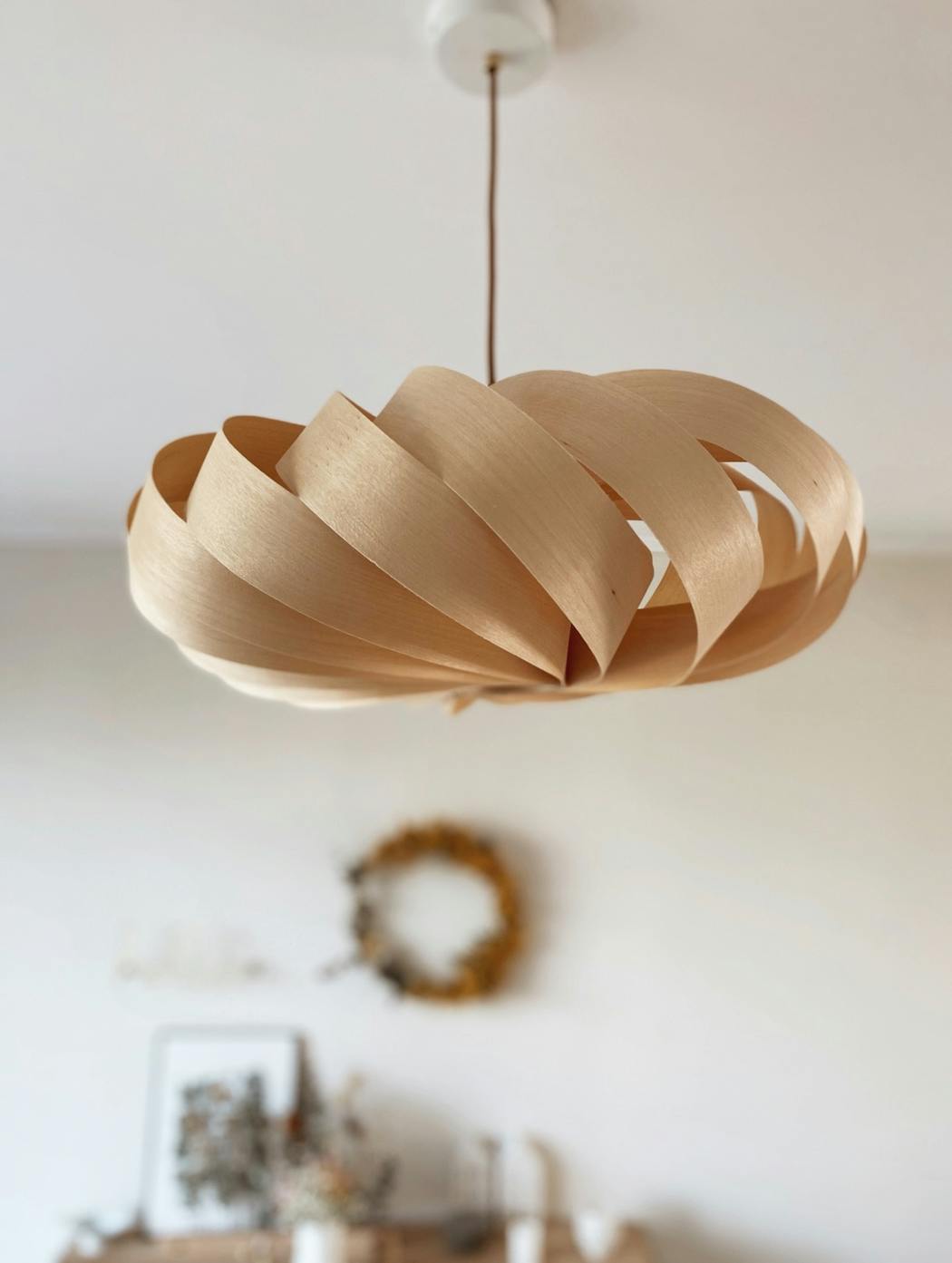 La suspension en ruban de bois : une pièce incontournable du design nordique des sixties, à reproduire en quelques minutes ! Pour la fabrication, commencez par découper 20 segments de 60 cm dans un ruban de placage bois (5 cm de largeur), puis percez le fond d’un vase en plexiglas de 15 cm de hauteur pour le passage du fil électrique. Tracez un cercle de même diamètre que le vase sur une feuille de papier. Divisez le cercle en 20 rayons égaux. Reportez ces marquages sur les deux rebords du vase, en haut et en bas. Collez l’extrémité du premier ruban, perpendiculairement au bord supérieur, et son autre extrémité sur la partie basse, à l’opposé. Réitérez l’opération jusqu’à recouvrir intégralement le support. Terminez en procédant au raccordement électrique.