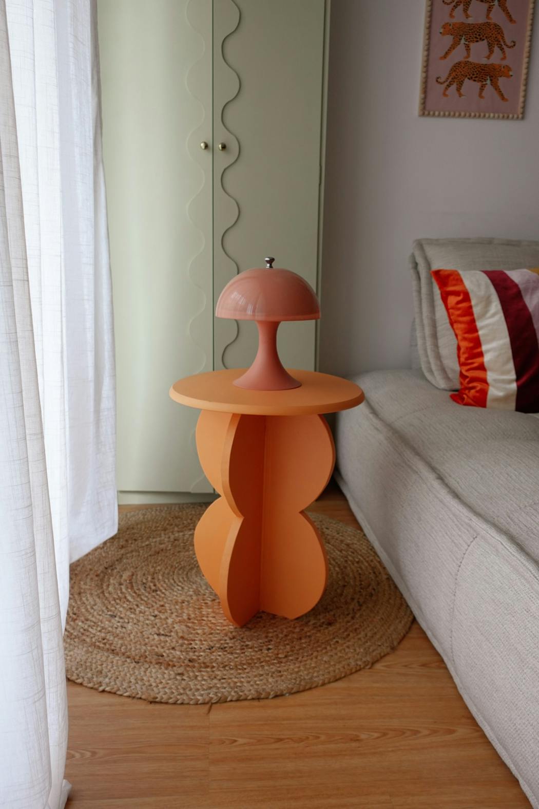 Comme Alicia, dont le compte Instagram @alichuree regorge de DIY d’inspiration vintage fun et coloré, créez votre table d’appoint mandarine, 100 % Le pouvoir des fleurs et années soixante-dix, à partir de simples chutes de bois. La marche à suivre pour la réaliser ? Première étape : découpez deux rectangles de L 46 x P 30 (ép. 2 cm) dans une planche de bois. Dessinez ensuite deux cercles en enfilade sur chaque rectangle. Tracez sur chacune des bases des deux cercles deux languettes de L 2 x H 23 cm qui serviront à imbriquer les planches. Découpez les contours ondulés des planches et les encoches à la scie sauteuse. Encollez-les puis imbriquez les deux découpes. Fixez un plateau rond à la colle sur la réalisation. Peignez l’ensemble. Laissez sécher…C’est fait !