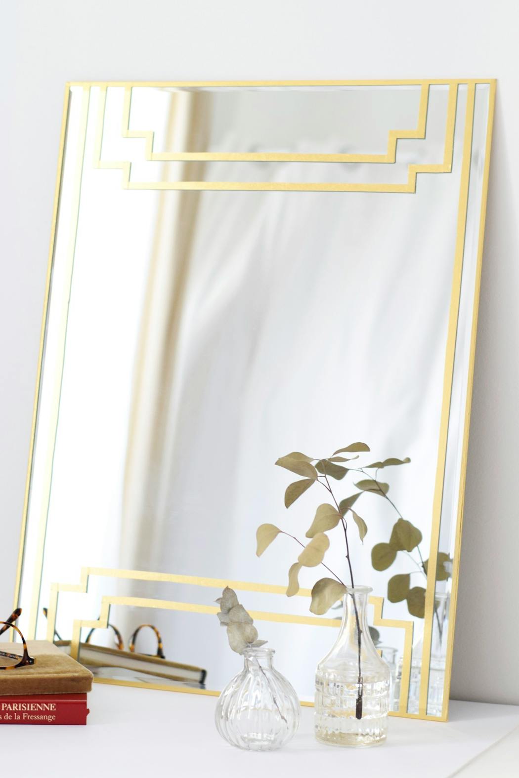 Emblématique du style Art déco, né en France au début du 20 ème siècle, les dorer et formes géométriques symétriques s’invite ici sur un miroir. Pour le réaliser, nettoyez le miroir avec un chiffon pour éliminer les poussières. Au feutre effaçable, marquez les repères des futures lignes géométriques sur le support, en veillant à créer un effet de symétrie. Munissez-vous d’un ruban adhésif doré mat, évocateur du laiton…Appliquez-le sur le miroir en suivant les repères préalablement réalisés. Admirez !