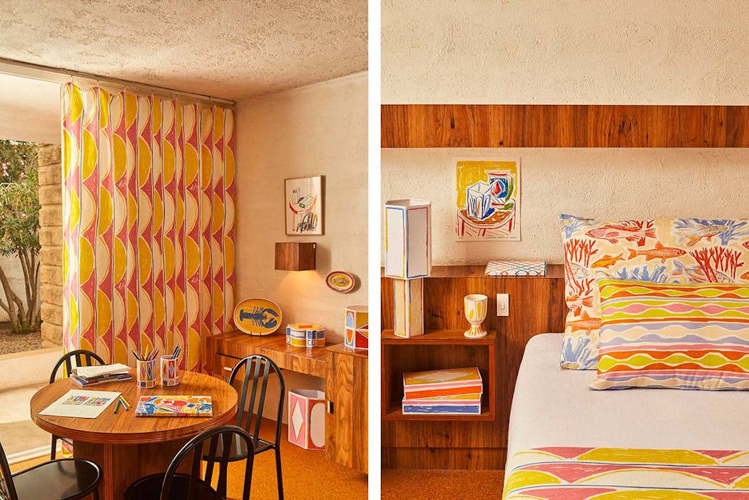 Un univers esthétique qu’il déploie ce printemps chez Monoprix, à l’occasion d’unecollection maison arty, shootée dans le décor délicieusement rétro de l’Hôtel des Cabanettes en Camargue. Au programme : de la vaisselledu meubles, dulinge de maison parés de couleurs solaires, de motifs patchwork stylisés, d’imprimés poissons, coraux ou vagues ondulantes… Ici et là, les coups de crayon transparaissent avec poésie, comme si l’artiste avait dessiné rien que pour nous sur le support. Une réussite !