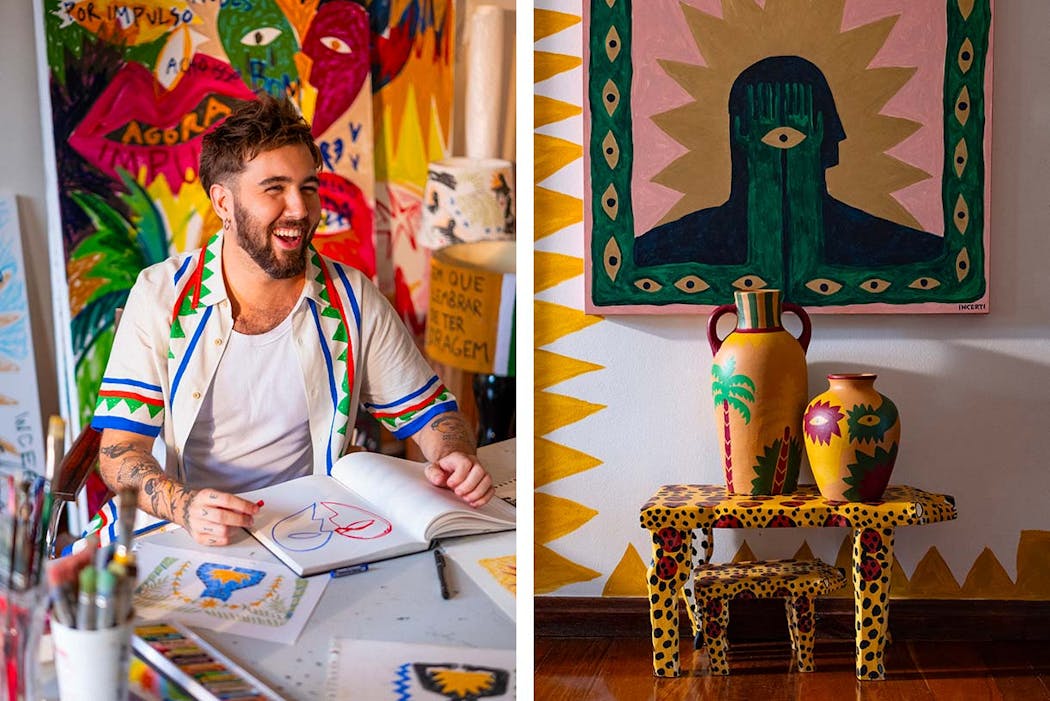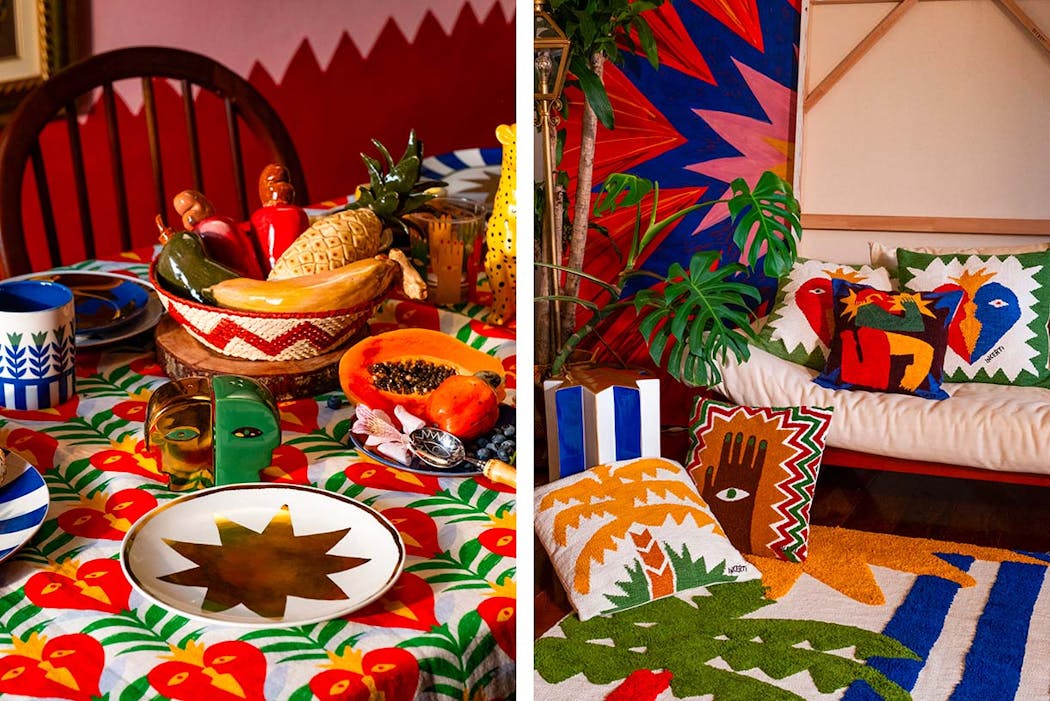 Tapis en laine, amphore en terre cuite, coussins et vaisselle aux motifs palmiers stylisés, éclats de couleurs vibrantes, imprimés étoiles rutilants… João Incerti à l’art de réinterpréter le folklore brésilien avec modernité et fantaisie…Un parti-pris esthétique qui nous séduit !