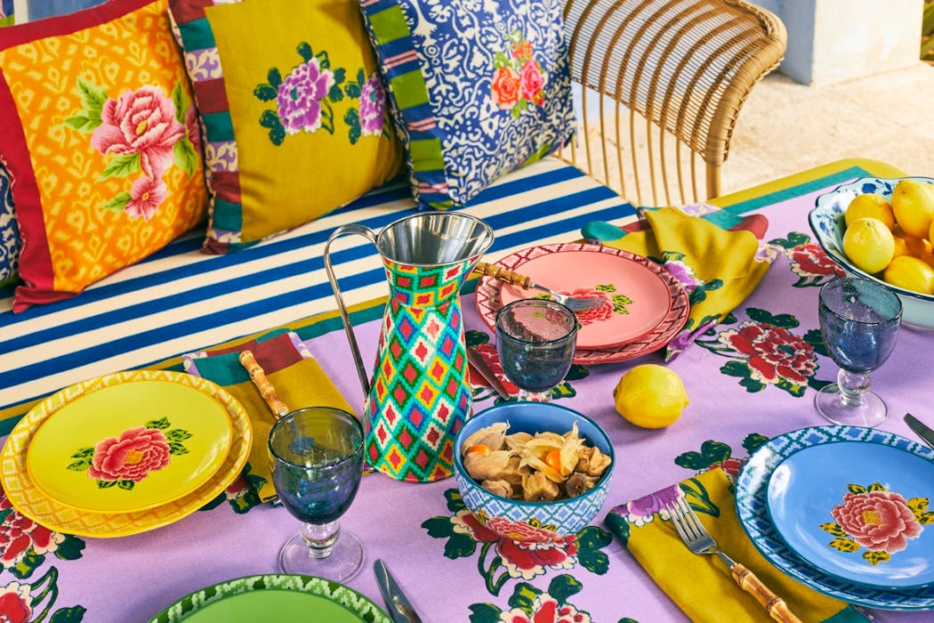 Lancée il ya 60 ans par la créatrice du même nom, la marque Lisa Corti fait voyager nos intérieurs entre Inde et Méditerranée. Reconnue pour ses imprimés ethniques et exotiques réalisations selon la technique du “blockprint”le label milanais, désormais dirigé par Ida, la fille de la fondatrice, lance en avril 2024 une ligne maison tout en couleur chez Monoprix.