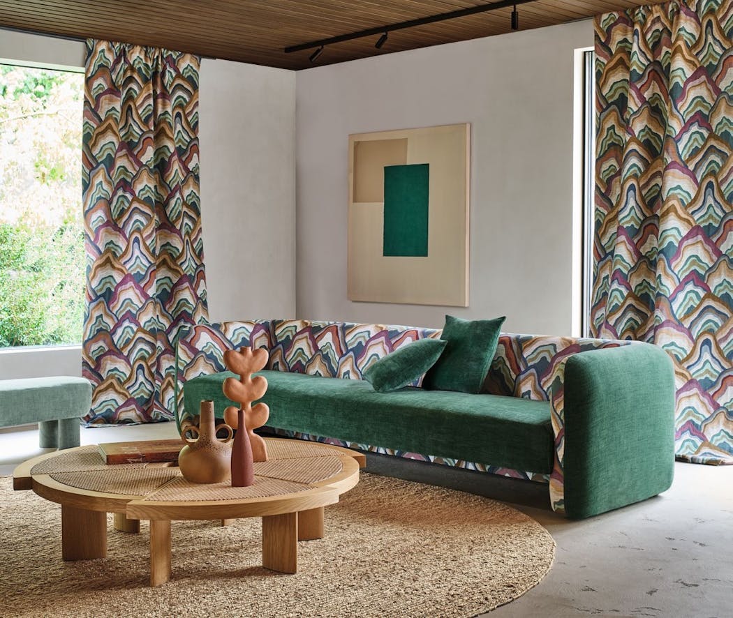 Des rideaux piqués de vert anglais au diapason du canapé, élément prépondérant du salon.