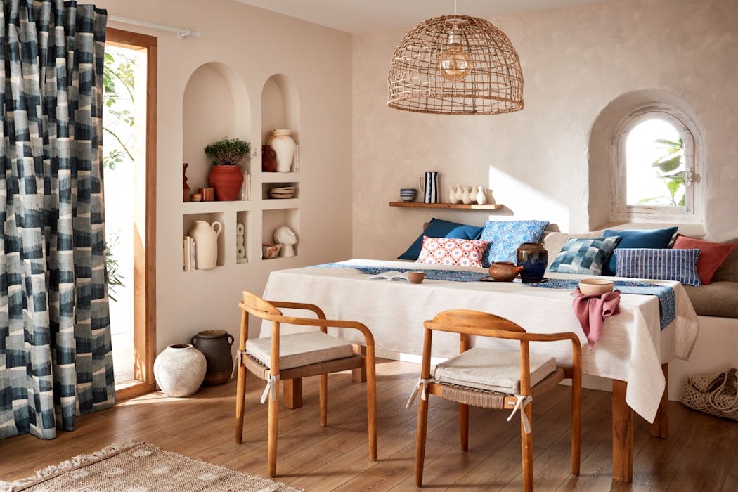 Dans la salle à manger, une étoffe de moyenne épaisseur pour préserver l’intimité en laissant passer la lumière.